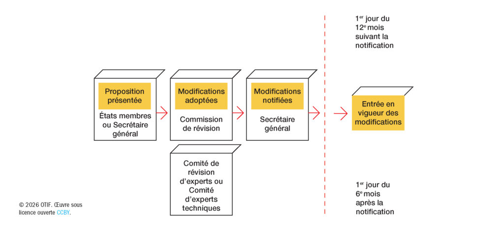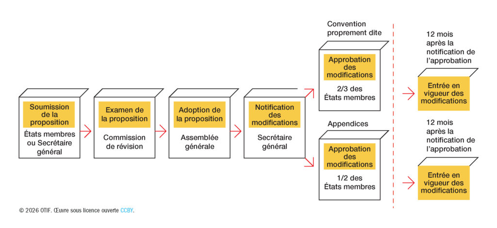 La révision de la COTIF suit deux procédures différentes en fonction du partage des compétences prévu en son article 33 :