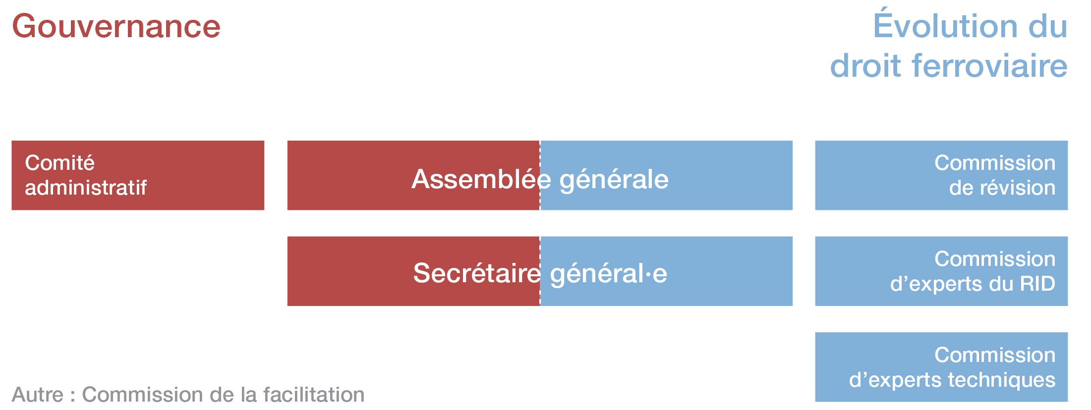Le fonctionnement de l’OTIF est assuré par sept organes permanents (article 13, § 1, COTIF 1999). Trois organes assurent notamment la gouvernance de l’Organisation et quatre autres, les commissions, font évoluer le droit ferroviaire de l’OTIF et contribuent à la facilitation du franchissement des frontières.